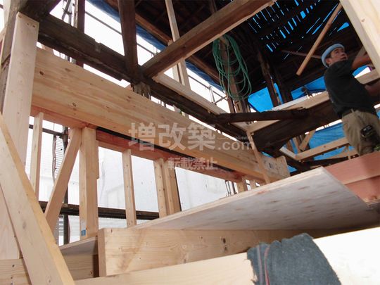 ▲再利用可能な梁を一部活かし、構造体を組んでいきます。