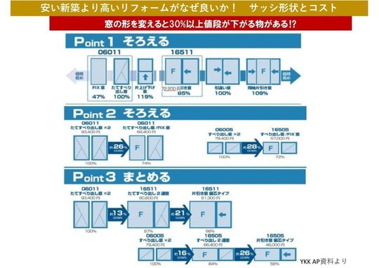 Point2のように、たてすべり出し窓を並べることがありますが、これもひとつフィックス窓にすると、値段が26%下がります。