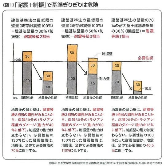 図1 耐震+制振で基準ギリギリは危険 出典 日経ホームビルダー2016年11月号「特集”効かない制震“を選ぶな!」より